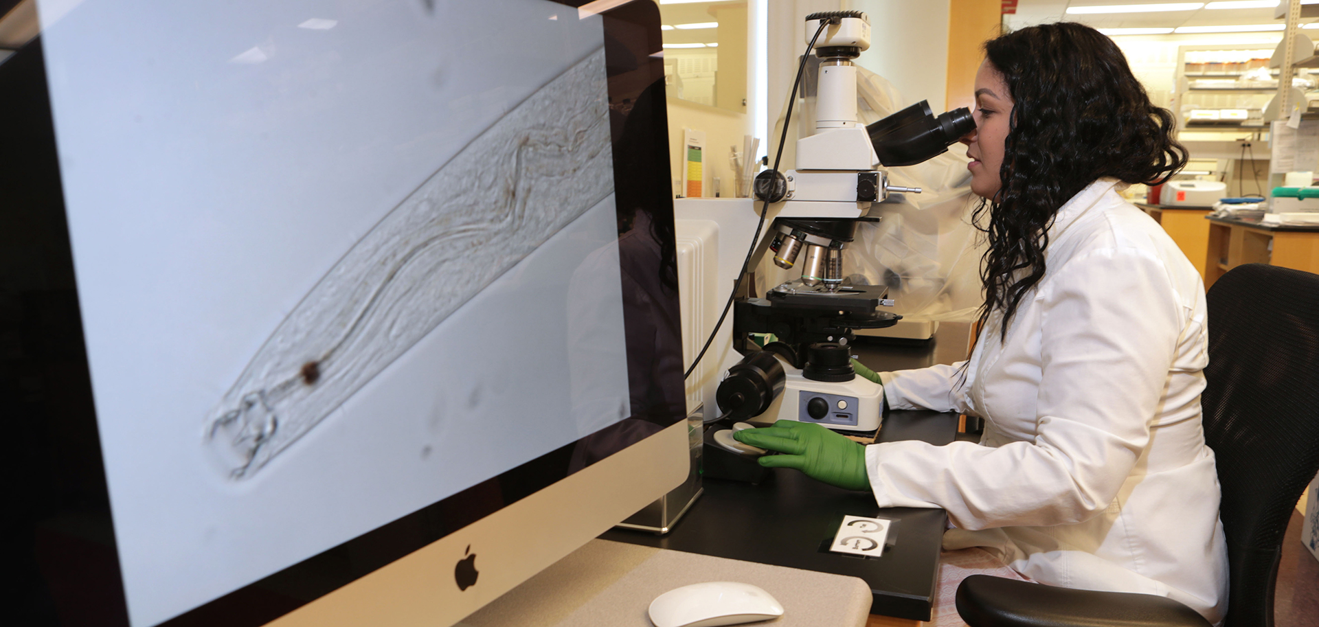 Mirayana on computer looking at nematode (c) UCR / CNAS
